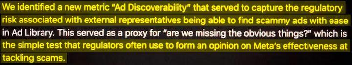 Internally, the documents describe this work as managing the "prevalence perception" of scams. The stated objective was to make problematic content "not findable" for “regulators, investigators and journalists.”