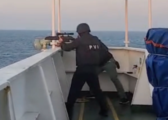 Shipping journal Lloyd's List posted exclusive footage showing security personnel on the ship firing long rifles at the small boats.