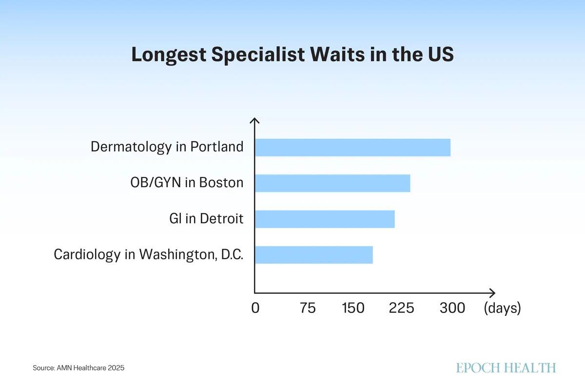 Specialist wait times vary dramatically by field and location. New patients wait about two weeks for orthopedic surgery, a month for cardiology and dermatology, and six weeks for obstetrics and gynecology—and often longer in big cities.