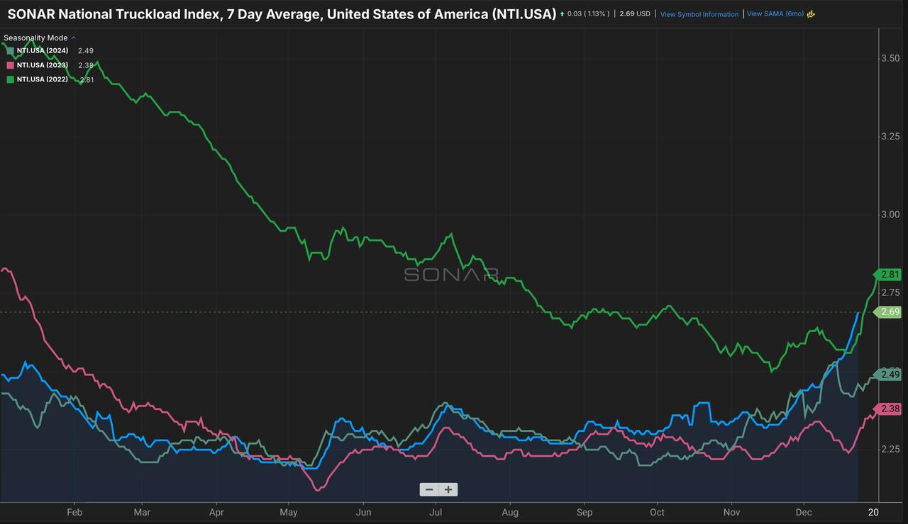 FreightWaves' Craig Fuller reports that the latest trucking spot rates have now surpassed 2022 seasonal levels.