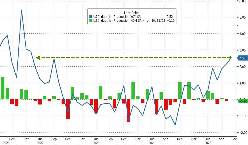 Following the much-stronger-than-expected GDP print, US Industrial Production also surprised to the upside, rising 0.2% MoM in November and pulling the YoY change up to 2.52% - the strongest annual growth since April 2022...