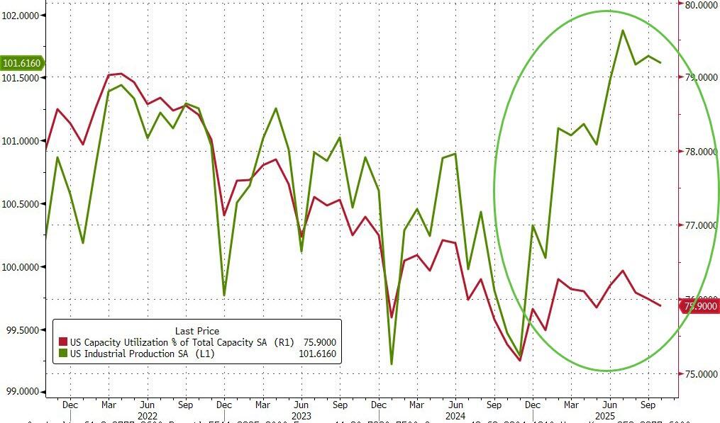 Capacity Utilization limped lower to 75.9% (from an upwardly revised 76.0%), but remains off the Nov 2024 lows...