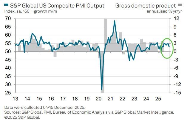 The headline S&P Global US PMI Composite Output Index fell to 53.0 in December from 54.2 in November, according to the 'flash' reading (based on about 85% of usual survey responses).