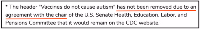 Remarkably, the CDC states that the headline phrase remains on the page only “due to an agreement with the chair of the U.S. Senate Health, Education, Labor, and Pensions Committee.”