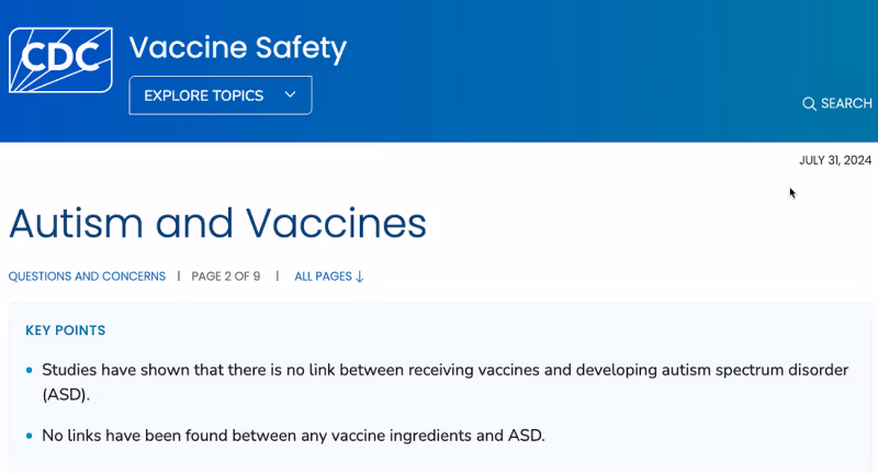 The CDC cites a series of authoritative reviews — including the 1991 and 2012 Institute of Medicine’s assessments, and the Agency for Healthcare Research and Quality’s review in 2021 — all concluding that the evidence was “inadequate to accept or reject” a causal relationship between early-life vaccines and autism.