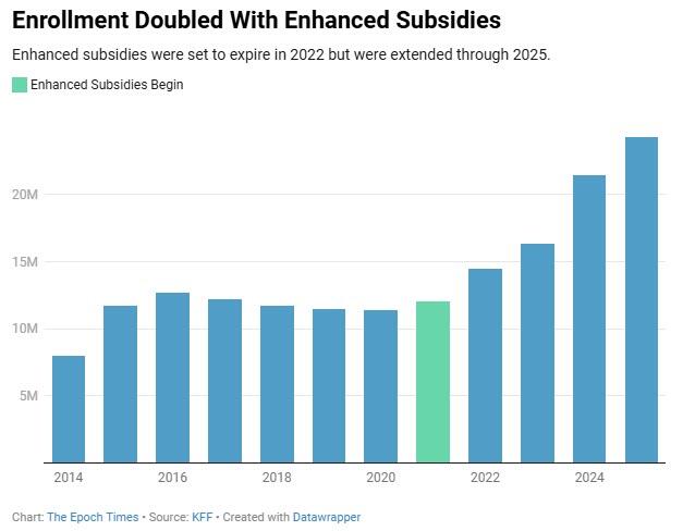 Enrollment boomed, jumping from 11.4 million to 14.5 million in two years. By 2025, enrollment had doubled from its pre-pandemic level, topping 24 million, according to data from health research organization KFF.