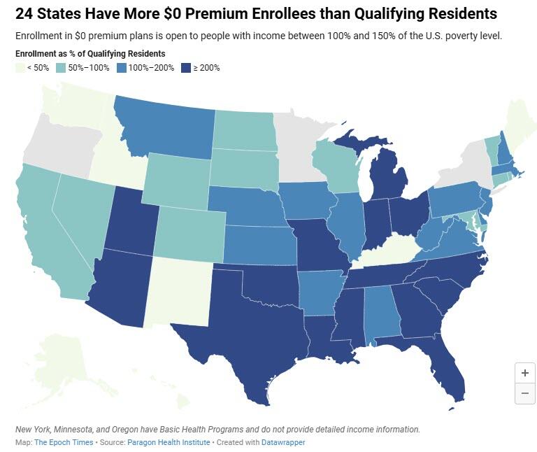 Another indication of fraud is the number of states where enrollment in Obamacare plans with a $0 premium is unreasonably high compared to the number with a qualifying income.