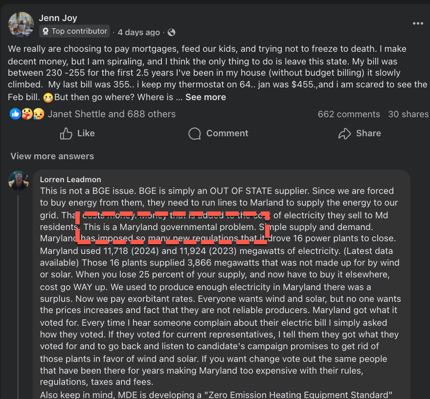 The Facebook group called "BGE Victims" has amassed 13.7k members, with many in the group pointing fingers at not just the local utility BGE or the grid operator PJM, but also the one-party rule of Democrats in the state who have masqueraded as competent managers but in reality are far-left activists looting the state's coffers to fund pet projects from supporting illegal aliens to all things woke.