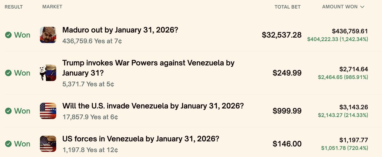 The account in question was created on Dec. 27, and quickly placed roughly $34,000 in bets on US intervention in Venezuela and Maduro's ouster both happening by January 31. On the Maduro prediction alone, the account scored a 1,242% gain, turning $32,537 into $436,760. At the time of the bets, the market placed the probability of intervention in January at just 6%.