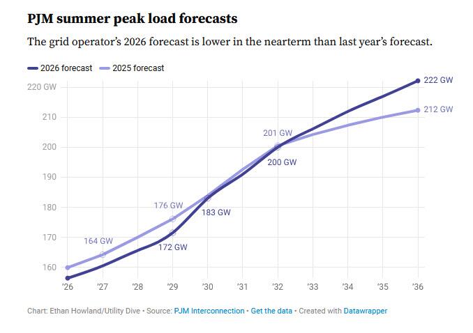 In a change that affects PJM’s upcoming capacity auction, the grid cut its peak demand forecast for the summer of 2028 by 4.4 GW, or 2.6%. It also lowered its forecast for the summer of 2027 by about 4 GW, reducing a reserve margin shortfall for that capacity year to about 2.6 GW.