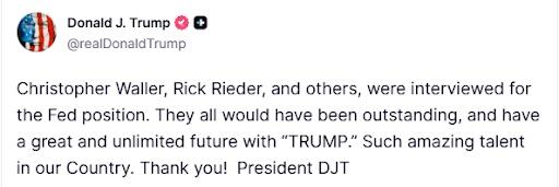 Nothing is official I'm told. But 1 source close to Trump says Warsh basically has the wink & the nod.