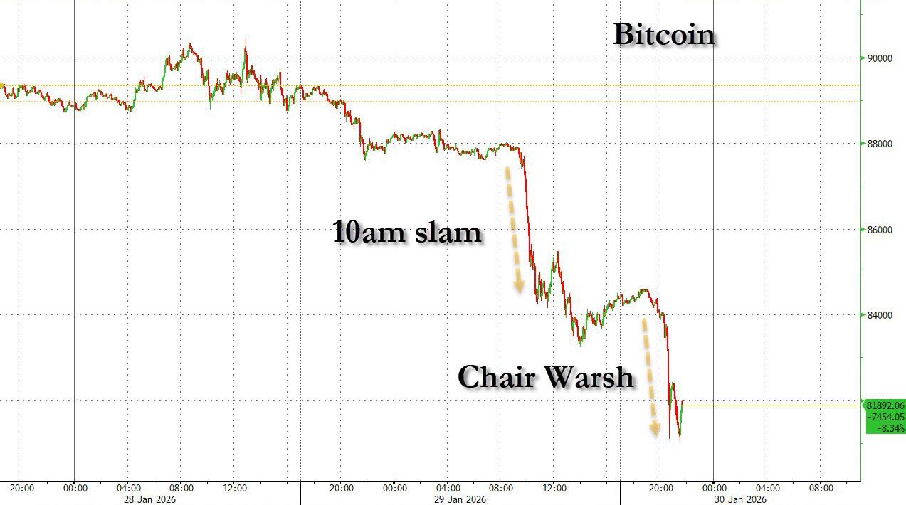 It wasn't just bitcoin: futures also fell, the dollar and treasury yields pushed higher (i.e., making housing not more affordable), and gold crashed again, on bets Warsh - best known as one of the most hawkish former Fed officials, often arguing for tighter monetary policy and a smaller Fed balance sheet, and who changed his tune only recently in hopes to ingratiate himself with Trump