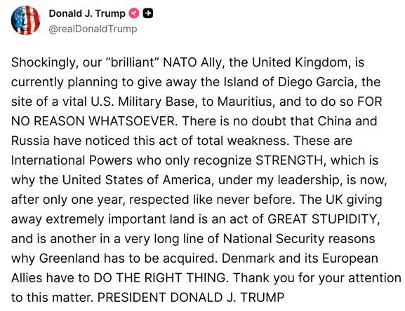 Early Tuesday the US president on social media blasted the UK government led by Prime Minister Keir Starmer, branding Britain's prior agreement to hand sovereignty over the Chagos Archipelago to Mauritius as an act of "great stupidity" and "total weakness."
