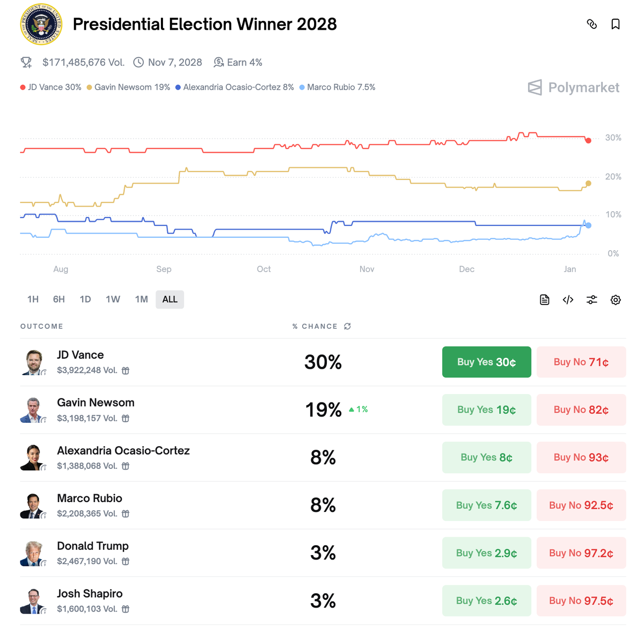 The timing of DOGE-style operations by citizen journalists in California comes as Polymarket odds for Newsom winning the 2028 presidential election currently stand at 19%.