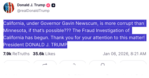 "California, under Governor Gavin Newscum, is more corrupt than Minnesota, if that's possible??? The fraud investigation of California has begun. Thank you for your attention to this matter!" Trump wrote on Truth Social on Tuesday.