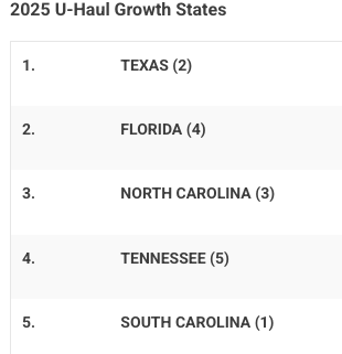 U-Haul just released its annual "Growth Index" for all 50 states. For the 6th straight year, California is ranked 50th. We have the highest rate of people moving out versus moving in.