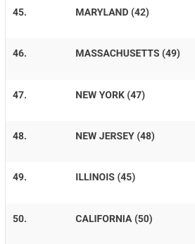 Conversely, the behavior-based migration indicator shows that blue states such as California ranked dead last - in other words, more people left than arrived. Illinois, New Jersey, New York, Massachusetts, and Maryland also landed at the bottom of the list. The common denominator among these states is that their political leadership focuses on being left-wing activists rather than proper stewardship of their respective states.