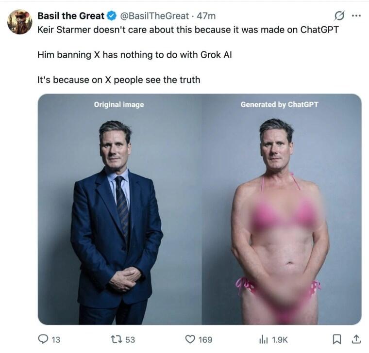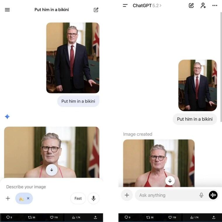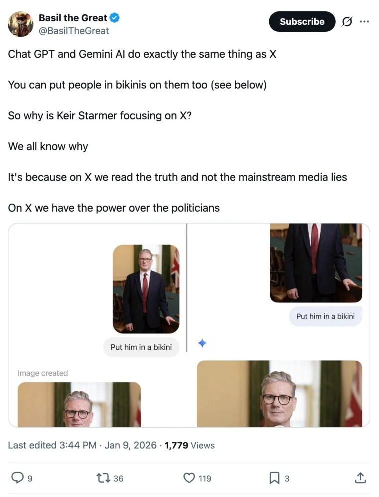 Starmer’s focus on Grok also completely ignores that other AIs, like ChatGPT and Google’s Gemini, enable the exact same image manipulations—putting people in bikinis or worse. All AI can do this, it’s clearly selective outrage.
