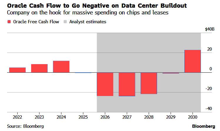 Developing AI data centers - without concurrently collecting cash from its clients - has pushed Oracle’s free cash flow negative, where it is expected to stay until 2030. As a result of its terribly structured deals, the company is on the hook for tens for billions of dollars in spending in the coming years, largely on semiconductors and leases.
