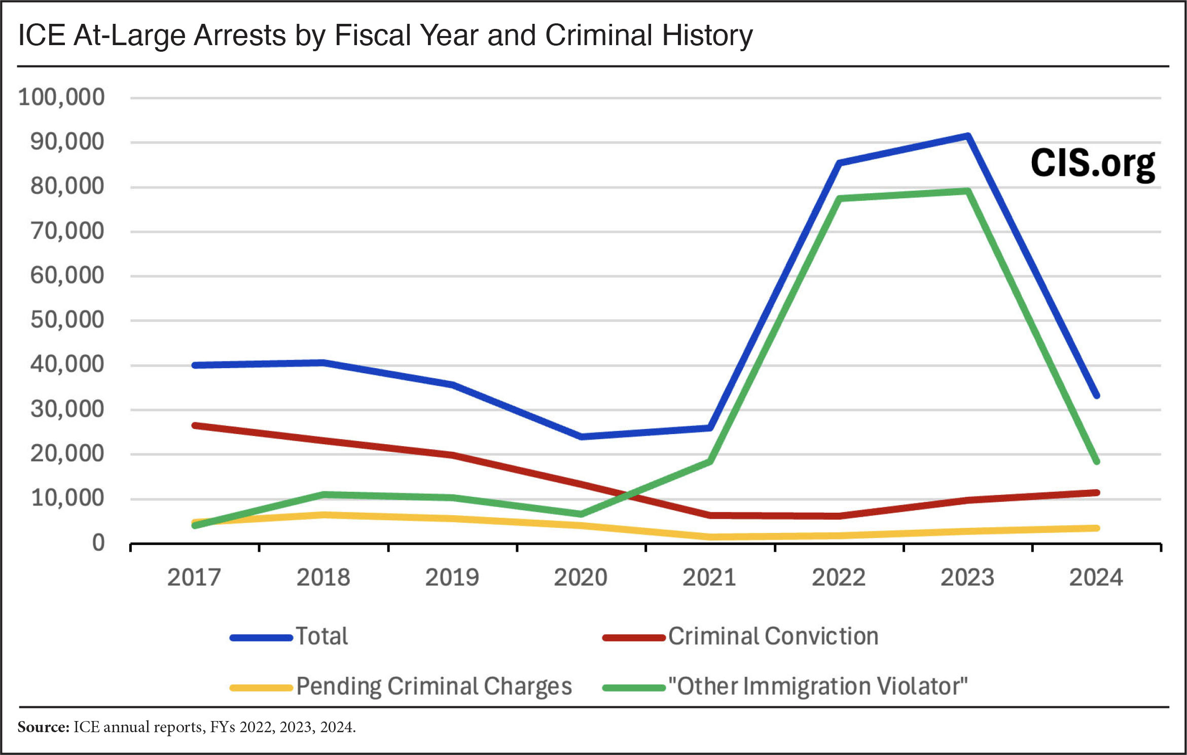 In FY 2017, the first partial year of the first Trump administration, 78 percent of the just over 40,000 ICE at-large arrests involved aliens with criminal convictions (66 percent) or pending charges (12 percent).
