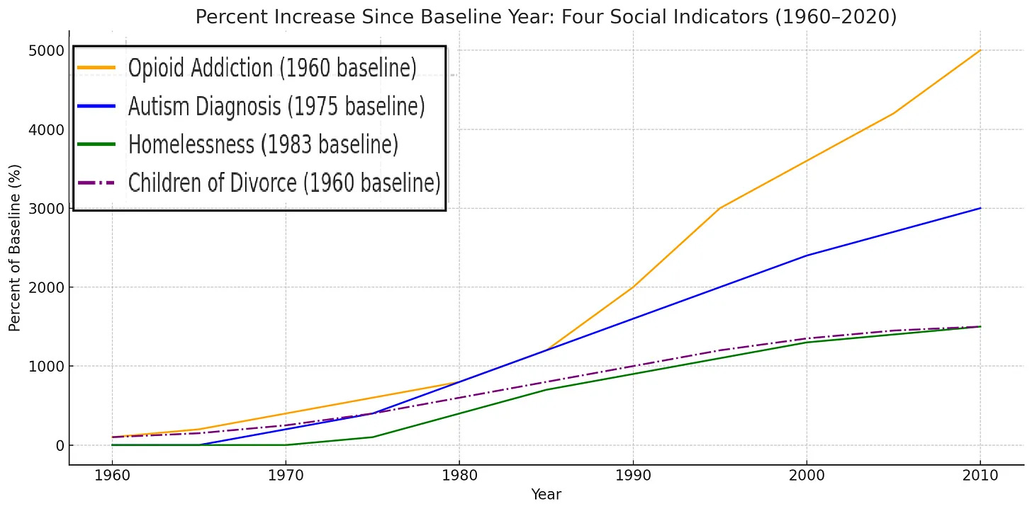 Autism’s rise also parallels increases in homelessness, opioid addiction, and other forms of psychiatric distress; lately “sexual dysmorphia”. These synchronized trends strain the plausibility of a single genetic or toxic cause acting uniformly across domains. They instead point toward shared structural drivers: diagnostic inflation, altered social expectations, incentive realignment, and expanded funding tied to labels.