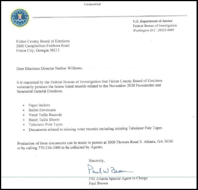 The reason for that removal now seems to come to light with the release of letter former Agent Paul Brown sent to Elections Director Nadine Williams giving her a head’s-up on the material the FBI was going to seize.