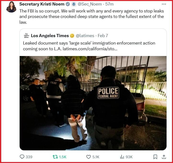 Secretary Noem facing down the internal resistors within the FBI, who have been leaking about ICE enforcement operations.