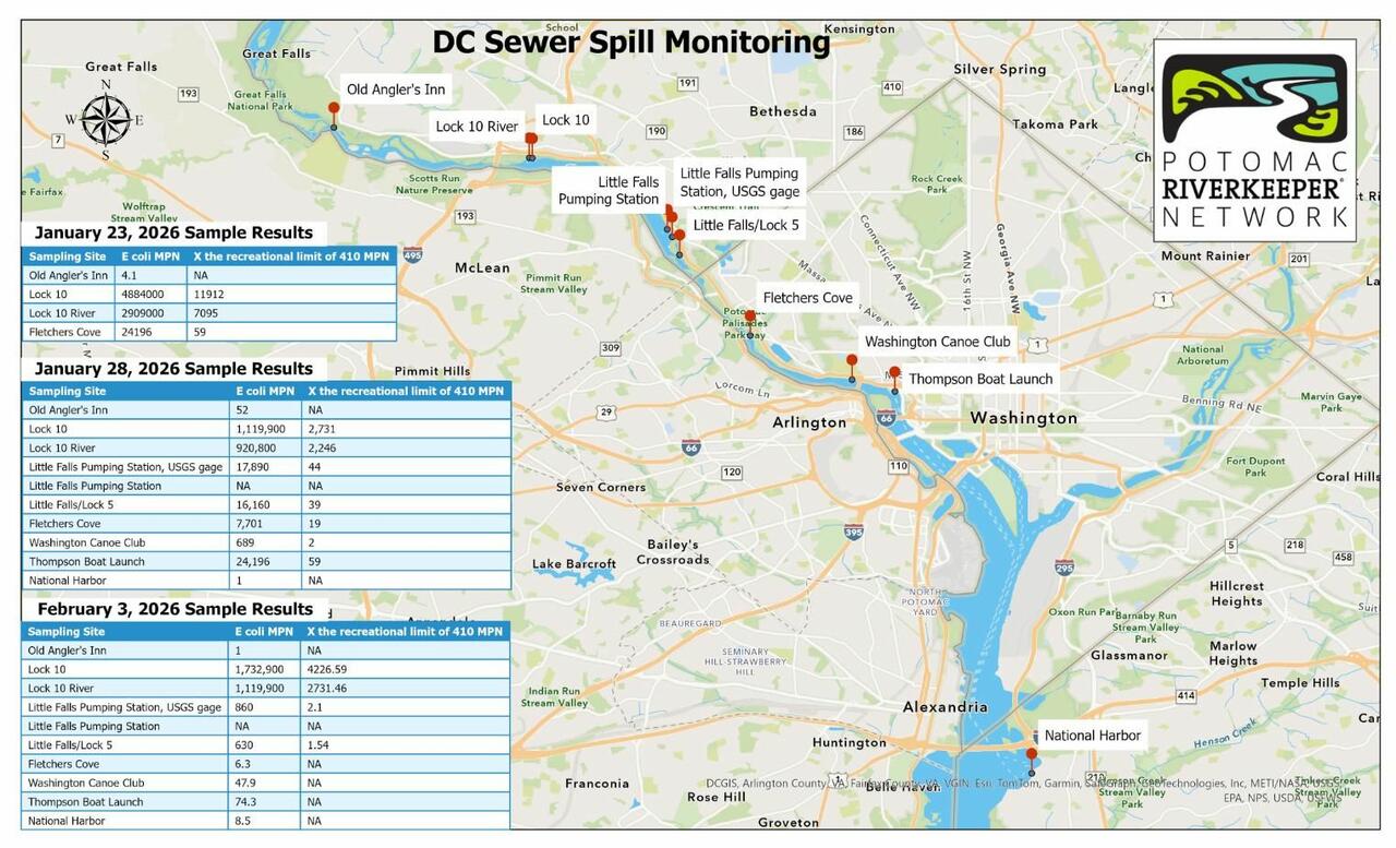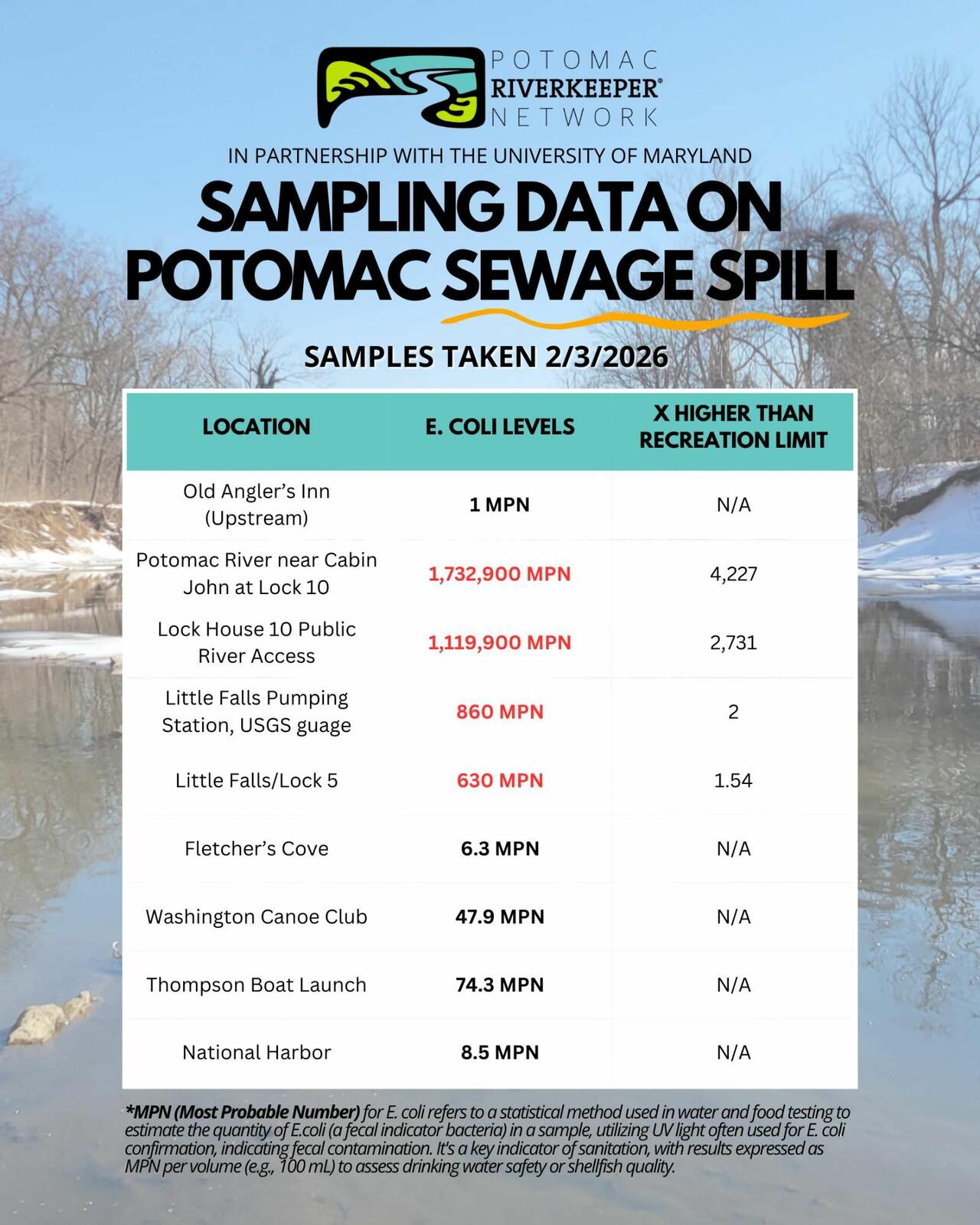 The environmental consequences have been immediate. Researchers from the University of Maryland reported that E. coli bacteria levels at a Potomac River monitoring site were 10,000 times above Environmental Protection Agency recreational standards two days after the Jan. 19 rupture. A week later, those levels had fallen but remained 2,500 times above federal guidelines.