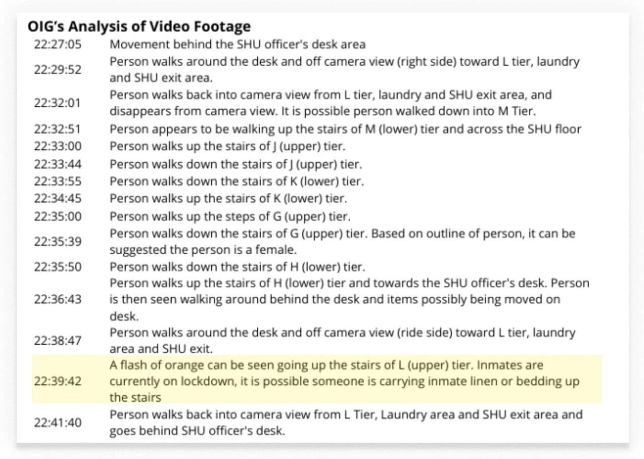 The observation was logged by the inspector general as an officer carrying orange "linen or bedding," noting it in their final report as "an unidentified [corrections officer]," despite the fact that the officers on duty said they didn't replace any linens, as that was done during the previous shift.