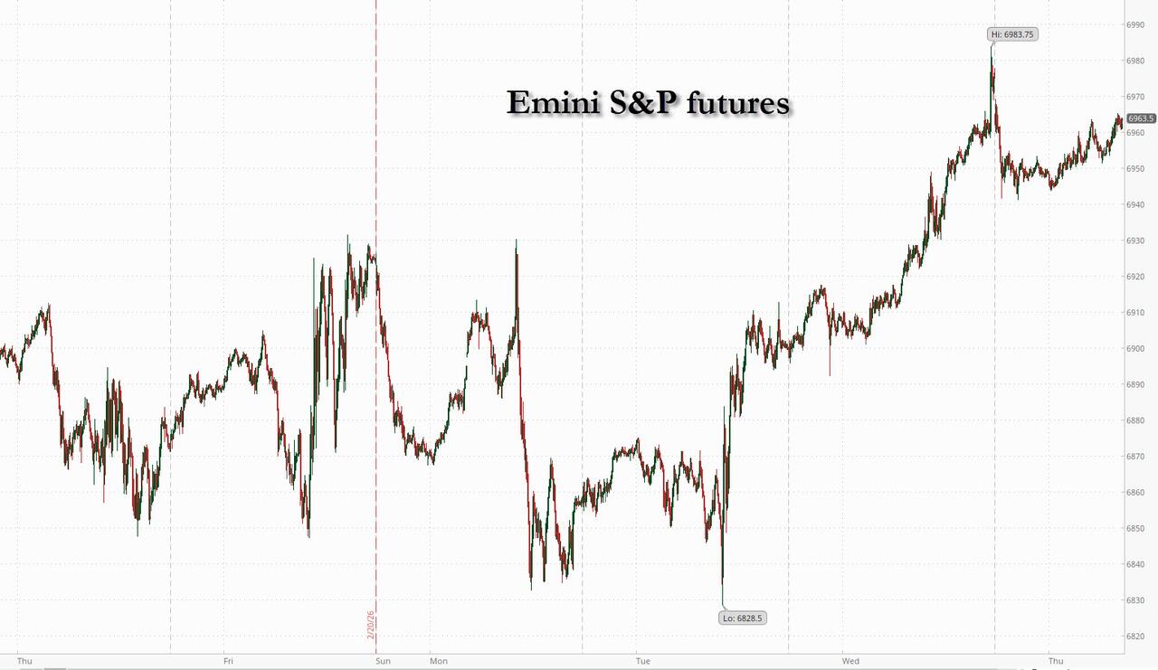 US equity futures managed to erase overnight losses and were trading flat after Nvidia and Salesforce failed to assuage fears about an overheated AI economy while traders awaited color from today's round of US / Iran talks. As of 8:00am S&P futures were unchanged and nasdaq futures were down 0.1%, with NVDA up 1% premarket but well off overnight highs after its earnings report and guidance smashed expectations while CEO Jensen Huang talked about “exponentially” growing computing demand and “skyrocketing” adoption of AI agents. It wasn’t enough, especially as software companies Salesforce and Snowflake both provided lukewarm sales guidance to an already-nervous market. “Aside from fireworks, champagne and dancing robots, we are not quite sure what more Nvidia could have done on the 4Q call to get the market re-excited,” said Jim Fontanelli, co-founder of Arete Research. Discretionary, Financials, and Industrials are outperforming with notable weakness in Energy and Materials. In premarket trading, Mag7 names were mostly weaker ex-NVDA though, as JPM says, bulls should not panic as we await Long Only demand once the market opens. AI-related plays are higher pre-mkt. Bond yields are flat, the USD is flat; in commodities lithium prices surged after Zimbabwe, one of the world’s top producers, suspended concentrate exports. Brent crude edged lower as nuclear talks take place between the US and Iran while silver stalled as it reached nearly $90/oz. Today’s macro data focus is on jobless claims, KC Fed, and several Fed speakers.