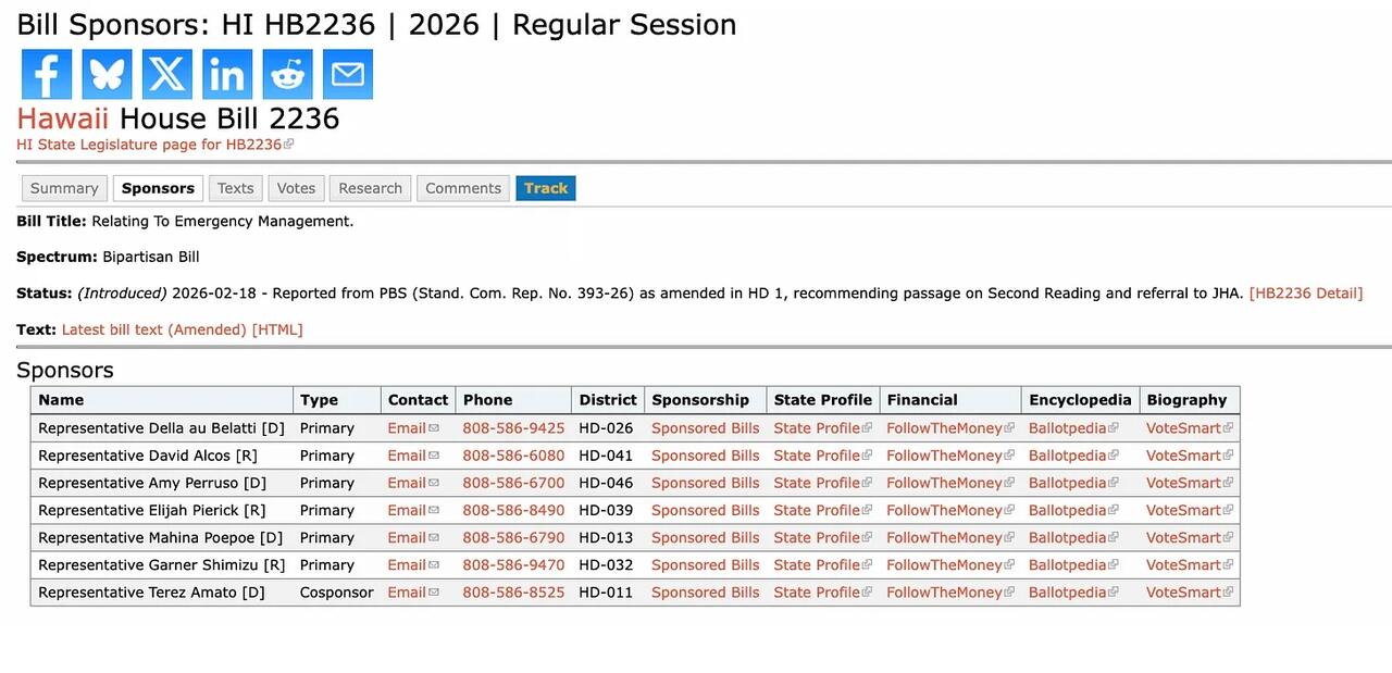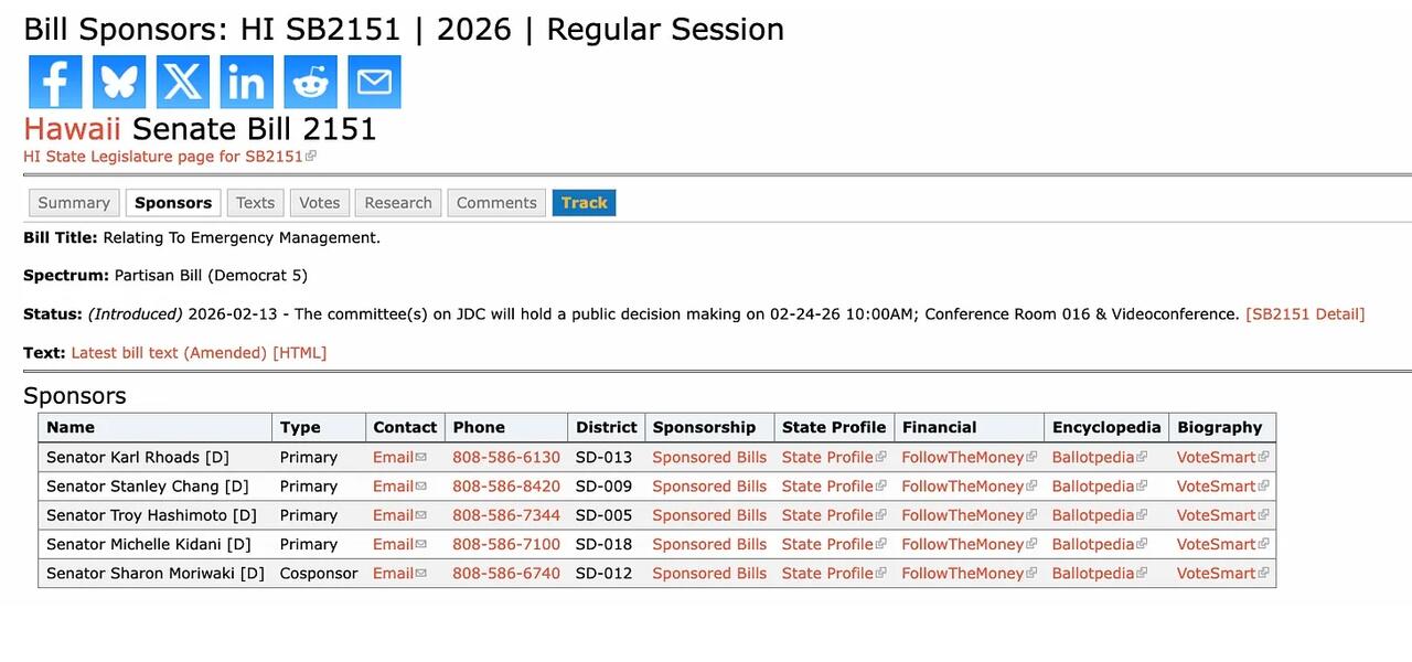 Legislative records show the bills are formally linked, with each designated as “Same As/Similar To” the other, confirming that Hawaii’s full legislature—not just one chamber—is advancing the emergency powers framework.
