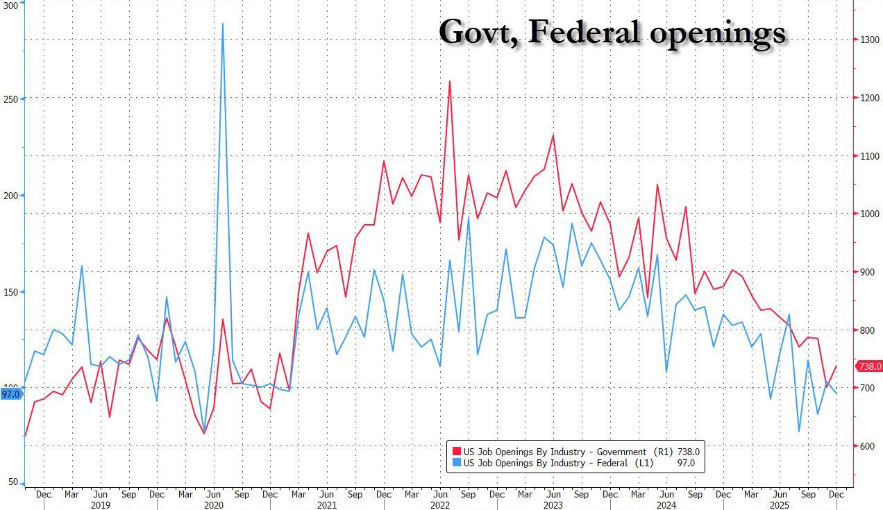 One curious observation: after tumbling to a 4 year low, the number of government job openings rose from 701K to 738K.