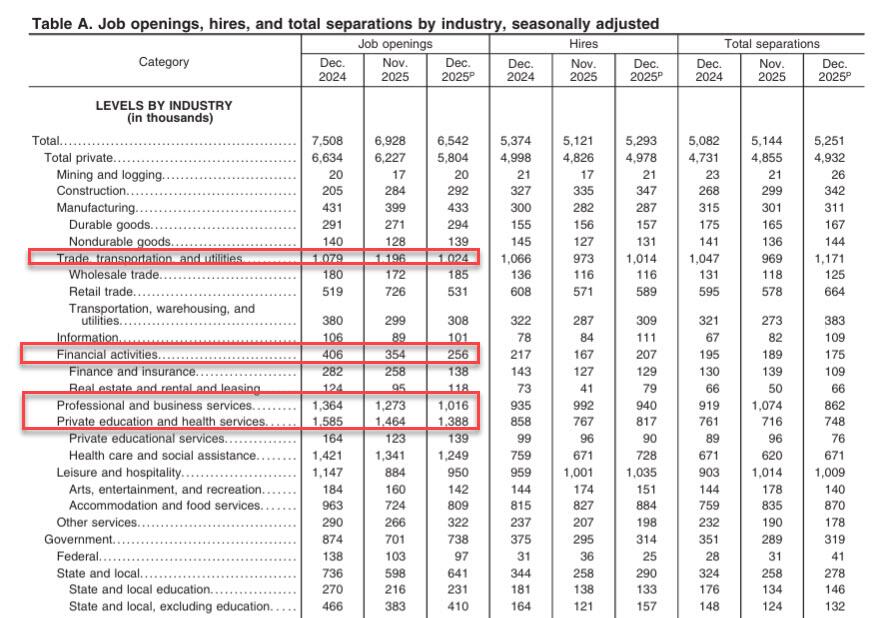 According to the BLS, the number of job openings decreased in professional and business services (-257,000), retail trade (-195,000), and finance and insurance (-120,000).