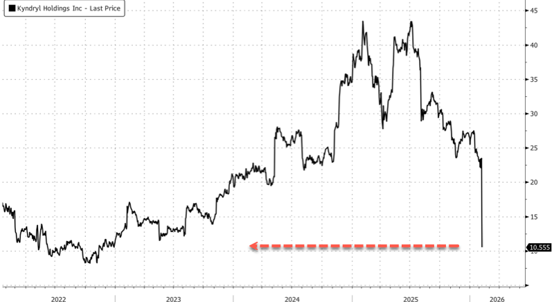 Shares in Kyndryl, an IBM spinoff and IT infrastructure services provider, crashed on Monday after the company warned investors that it is reviewing certain accounting practices amid an inquiry from the Securities and Exchange Commission. The company also posted third-quarter results that missed Bloomberg Consensus estimates and disclosed what JPMorgan analysts described as a "surprise" departure of its CFO.