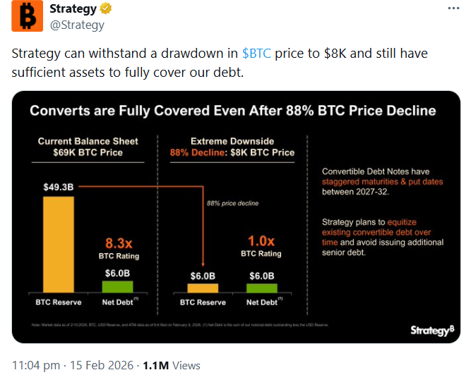 - "Strategy can withstand a drawdown in $BTC price to $8K and still have sufficient assets to fully cover our debt," the Michael Saylor-led company said on X.