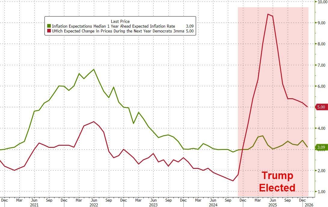 Going back to where we started above, why was it that for the entire term of President Biden, Democrats surveyed by UMich saw future inflation expectations dramatically below that of the NYFed's survey respondents...