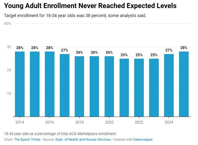 At the close of its first enrollment period in 2014, Obamacare had an enrollment pool that was just 28 percent young adults aged 18–34. A Commonwealth Fund report indicated that people whose premiums increased had been slightly less likely to buy insurance in 2014. Young adults would have been among those whose rates went up.