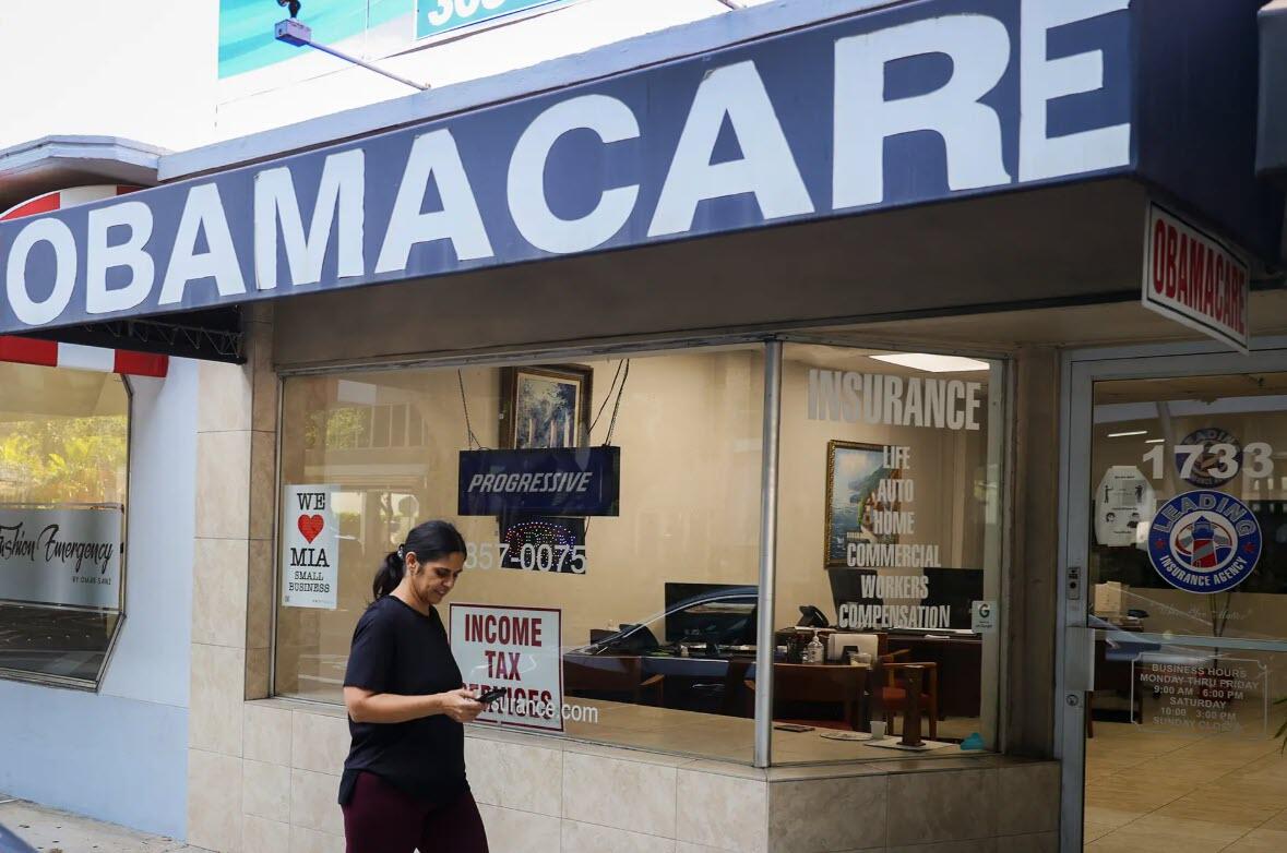 A pedestrian walks past an insurance agency that offers Affordable Care Act plans, in Miami on Jan. 28, 2021. Following the COVID-19 pandemic and enhanced subsidies approved by Congress in 2021, enrollment more than doubled, reaching a record 24.3 million in 2025. Joe Raedle/Getty Images