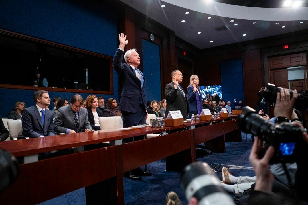 (L-R) Minnesota Gov. Tim Walz, Minnesota Attorney General Keith Ellison, and Rev. Mariah Tollgaard, are sworn in ahead of their testimony before the House Committee on Oversight and Government Reform on Capitol Hill in Washington on March 4, 2026. Madalina Kilroy/The Epoch Times
