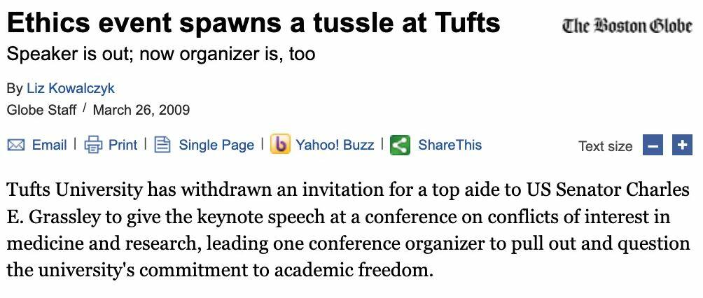 FULL DISCLOSURE: While working in the Senate, I was invited to give the keynote address at a conference on conflicts of interest in medicine and research hosted at Tufts University. Administrators later withdrew my invitation, causing one of the organizers to resign and creating a minor scandal that made news in the Boston Globe.
