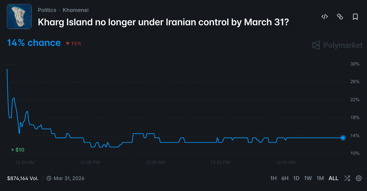 Polymarket odds on whether "Kharg Island no longer under Iranian control by March 31?" stand at around 14% as of 10:30 ET.