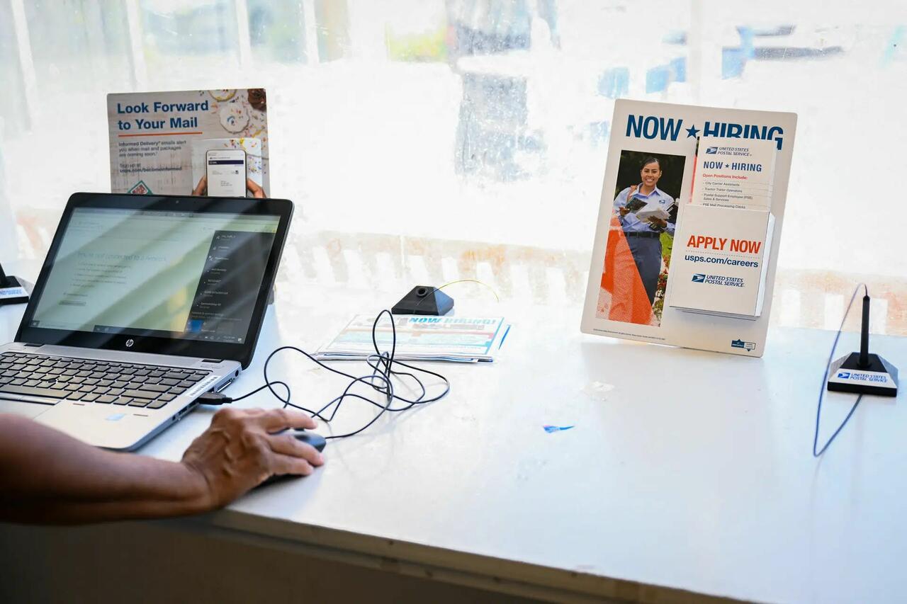 An employee sets up a laptop for a job application page during a hiring fair for postal workers and mail carrier assistants at a U.S. Postal Service facility in Inglewood, Calif., on July 18, 2022. Patrick T. Fallon/AFP via Getty Images