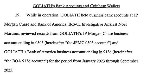 The separate federal complaint paints a broader picture, saying investor funds were primarily deposited into the JPMorgan 0305 account, the Bank of America 9136 account or sent directly to Goliath wallets at Coinbase. Prosecutors said about $75 million went into the BOA account and about $62 million was received directly by Coinbase wallets.
