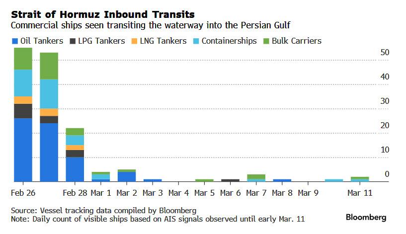 This morning, Bloomberg confirms that while mainstream Western shipping remains largely suspended through the Strait of Hormuz, recent 24-hour observations reveal a jump in Iran-linked traffic, specifically involving two sanctioned (read China-focused) VLCCs.