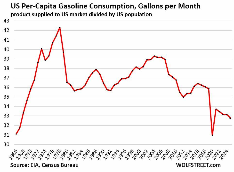 Per-capita gasoline consumption fell to 32.8 gallons per month in 2025, the lowest since 1967, except for the Covid year 2020, as a result of declining overall gasoline consumption amid a growing population.