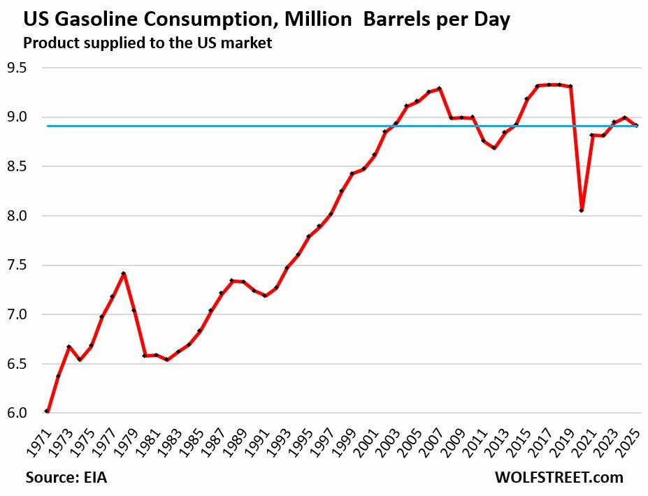 Gasoline consumption in the US, in terms of product supplied to gas stations, declined by about 1% in 2025, to 8.91 million barrels per day, according to EIA data, below where consumption had first been in 2003, even though the US population increased by 52 million people, or by 18%, over the same period.