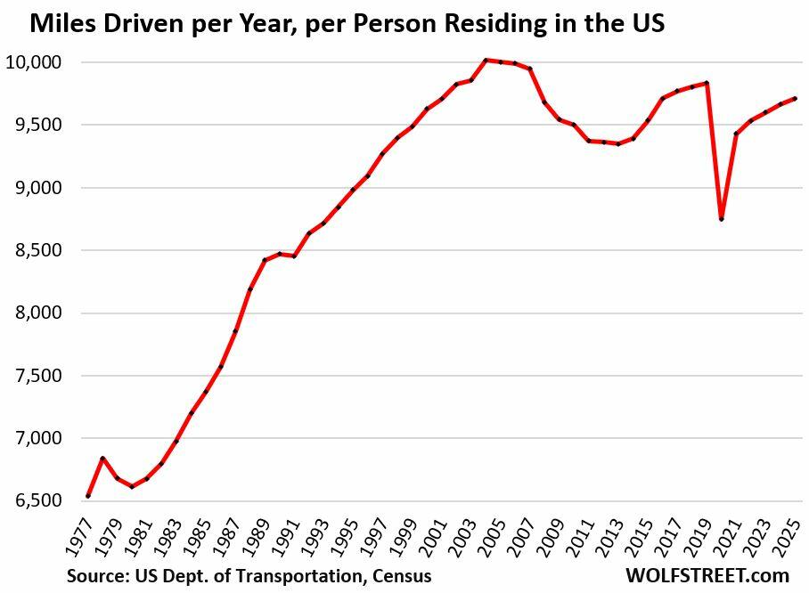 But people drive a little less: Miles driven per person residing in the US, at 9,710 miles in 2025, was 3.1% below the peak in 2004.