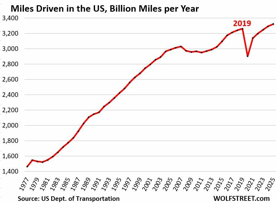 Miles driven edged up 0.9% in 2025, to a record of 3,324 billion miles, according to data from the Department of Transportation (includes miles driven by cars, light trucks, buses, motorcycles, delivery vans, and commercial trucks). But that’s only 9.7% higher than at the prior peak in 2007.