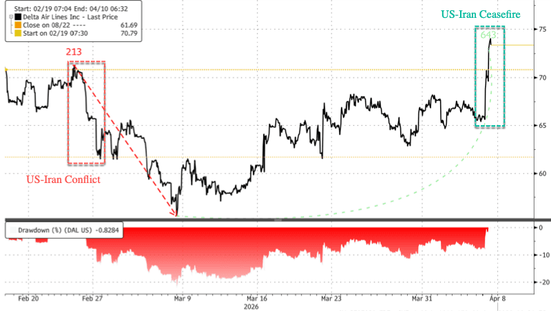 Delta Air Lines soared in premarket trading on a combination of the U.S.-Iran ceasefire and stronger-than-expected first-quarter results, with the carrier's in-house refinery helping to lower the average jet fuel price for its fleet in the first quarter, making it appear to be one of the better-positioned carriers than most peers to withstand an energy shock.