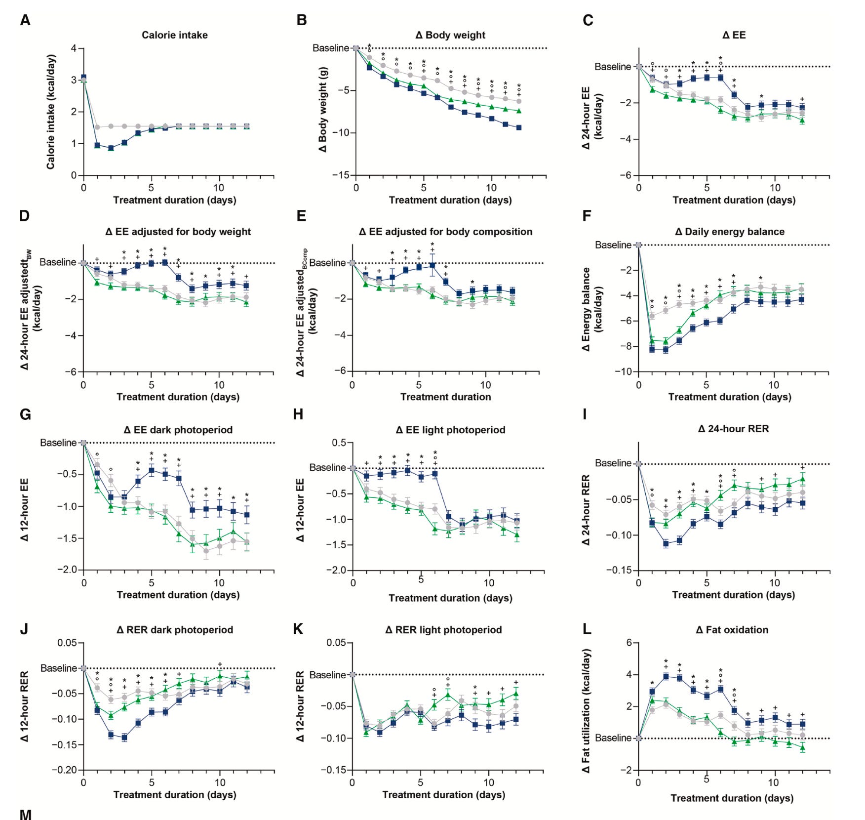 Here’s what that looked like in all the parameters the researchers measured. The tirzepatide-treated mice are the blue lines; the pair-fed mice are the green-lines and the placebo group without pair-feeding is the grey lines. (Notice that the green line and the blue line overlap in the first chart, A, showing calorie intake. This perfect overlap is the pair-feeding.)